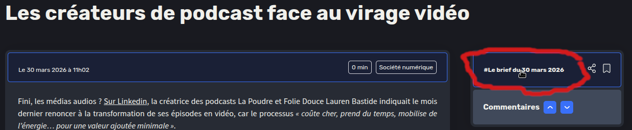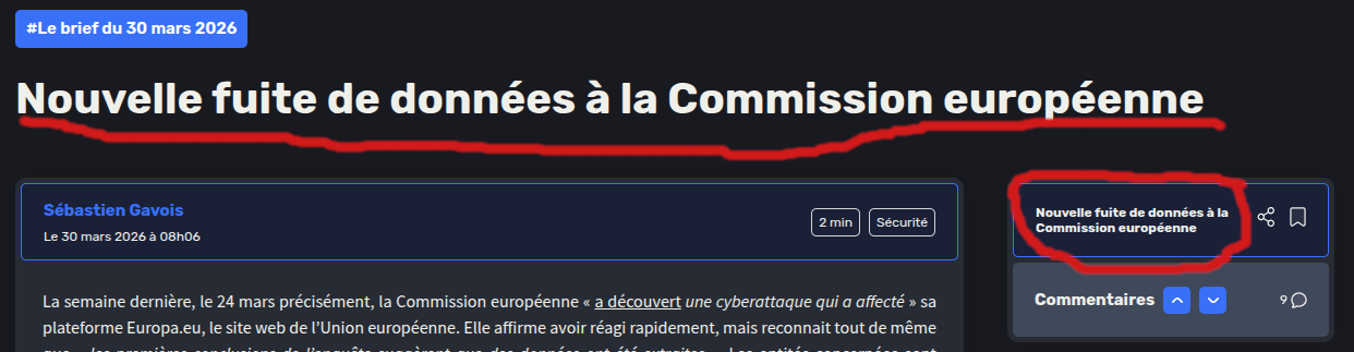 Même en me remisant, je ne suis pas certain d'avoir été très clair sur le problème des commentaires de brèves dans l'affichage du Brief. La première image montre que le gros titre de la brève n'est pas cliquable, ni le même titre, repris en plus petit, dans le cadre à droite, J'ai regardé le code derrière ce titre, et il est censé l'être : <div id="title-0-sommaire" onclick="Bifrost.goToTitle("next-title-single-post")" class=""> <h3>Nouvelle fuite de données à la Commission européenne</h3> </div>A noter que, si l'on déplie les options de partage, la copie du lien fonctionne. La deuxième image montre que, sur une brève sans commentaires, le lien du cadre de droite n'est plus le titre de l'article, mais celui du digest (il renvoie en haut de page) Les deux dernières images montrent la même brève telle qu'elle est incluse dans le digest (sans commentaires) et visualisée depuis le flux global du site (avec tous les commentaires à jour au moment de l'affichage. J'espère avoir été plus clair...