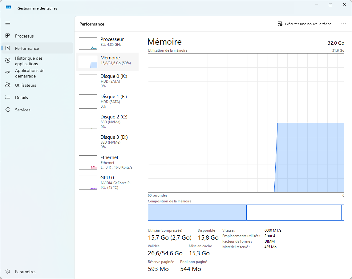 T'as quoi comme logiciels lancés au moment du screenshot ? À moins que je lis mal, mais sur les 32go physique, ça en bouffe déjà 23Go comme ça ?! Oo Chez moi Sous win 11 fraichement installé avec un mmo UE4 et un chrome blindé d'onglets avec la gestion du swap en automatique sur mon SSD principal, je suis à peine à 15go utilisés sur 32 go physique ... Avec tous les bloatware win 11 par défaut et Alienware à cause de mon écran et son hub usb ...