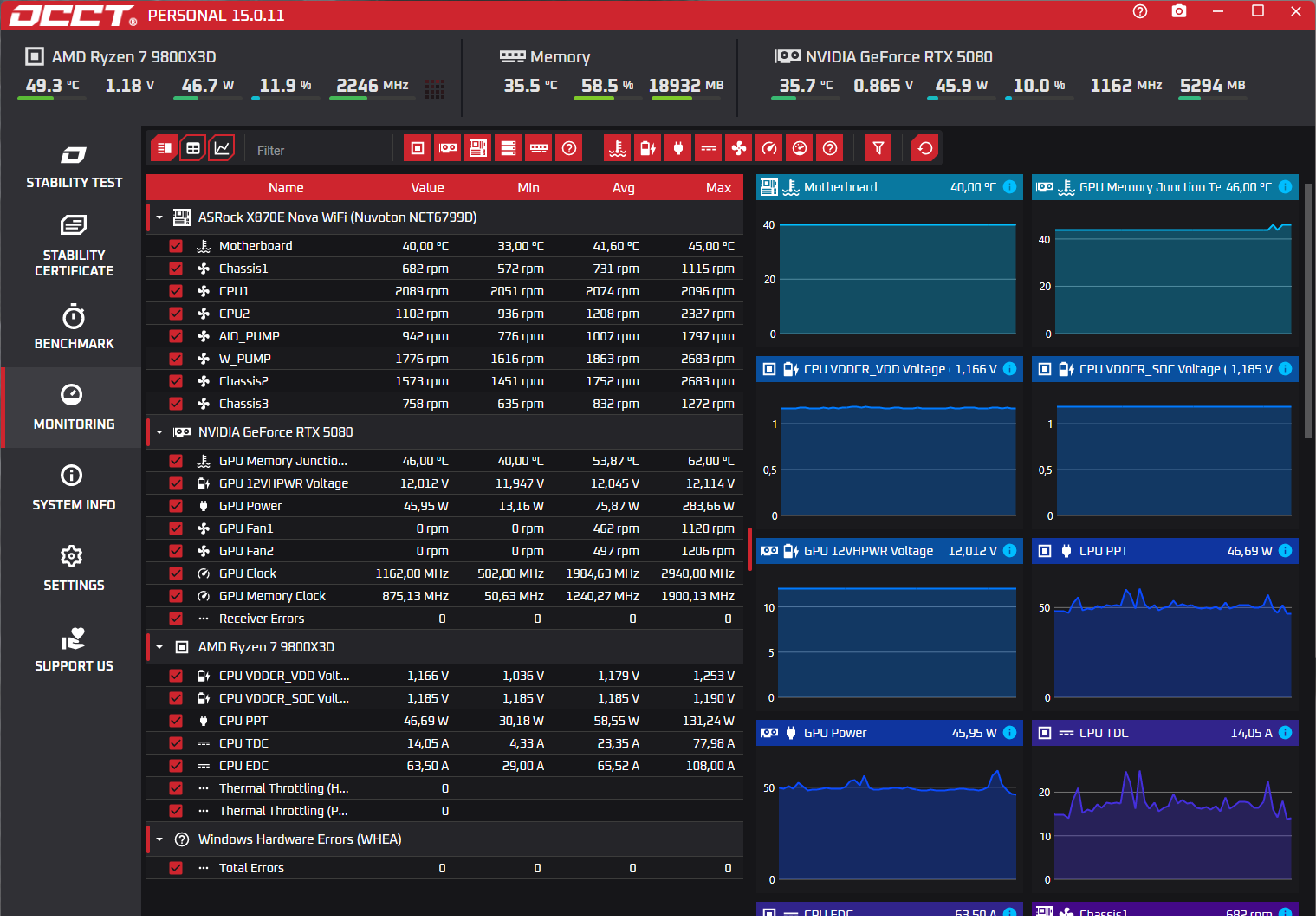 Si jamais t'as du mal à trouver une erreur, utilise OCCT > Monitoring : Tu coche pour la partie GPU "Receiver errors" et WHEA, tu pourras vérifier si'l n' y a pas une erreur niveau système, CPU si tu le souhaites (erreurs général, ram, pendant une tâche lourde, etc ...), et SURTOUT le GPU qui nous concerne (plantage driver sans crash/brick le système ou autre crash jeux 3D récupérable)