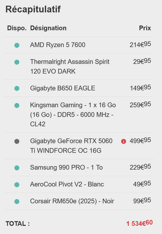 la config en soi n'est pas déconnante après il manque un ventirad pour refroidir le cpu. Ensuite vu l'envolée des prix de la ram et de tout ce qui est puce de mémoire en général la config n'est plus du tout à 1000€ il faut compter dans les 1500€ maintenant. Et attention lors du choix de la 5060 ti ne pas prendre la version 8Go qui bien plus limité que sa soeur en version 16Go.