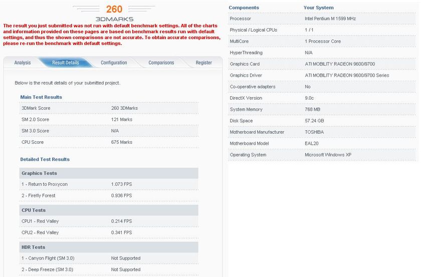 Posté(e) le 24 mars 200718 a Pour le fun, j'ai lancé 3DMark06 sur mon portable (centrino 1.6 ghz, 768mo PC2700, ATI 9700 64mo). Par contre c'est du 1280*800, et non du 1280*1024 comme par défaut... no comment ...... PS : j'ai meme pas pu lancer le test HDR/SM3, apparemment non supporté par ma carte :lol: